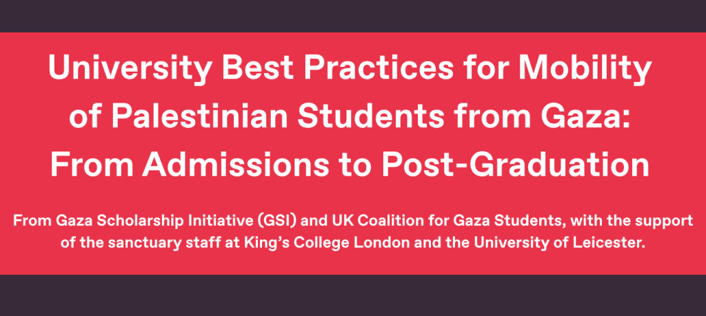 Gaza Scholarship Initiative (GSI) and UK Coalition for Gaza Students, with the support of the sanctuary staff at King’s College London and the University of Leicester, have released Best Practices for Universities across the UK to refer to when supporting students who work with Palestinian students from Gaza. Please see their full statement and the link to the document below.